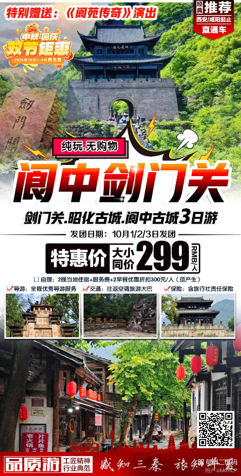 早餐后游劫览5A景区【剑门关风景区】这里是巴蜀要冲,历代兵家必争之地。这里曾发生过-百余次战争、十多位帝王莅临并有无数的文人墨客留下了近四千幅作品。当年蜀将姜维凭借“一夫当关,万夫莫开”的蜀道天险,拒魏军十万之师于关外。如果您体力不佳,两程有惊无险的索道送您登上顶峰。让您瞬间感觉“蜀道难,难于上青天”只不过已成为历史。如果有足够的胆量和过硬的身体素质,您可以身临险境自费体验--猿猱道的惊险刺激。景区内多条爬山线路、观光车、高空滑索、休息区、医疗站、设施方便,出景区后自理中餐,后入住,晚上可自由活动欣赏千年的魅力夜景。后前往观看.《阆苑传奇》以阆中数千年的历史文化为底蕴,以一名音乐人遭遇创作瓶颈,奔赴阆苑仙境,在阆中古城寻找灵感、突破自我、开启新的创作之旅为主线。整个节目主体为五个篇章:阆苑仙葩,万夫莫敌,天人合一,千年绝恋,九州同春。主要分别展现阆苑仙境与人祖华胥之绝世美艳,张飞护佑阆中之勇武无敌,李淳风、袁天罡两位大师与阆中古城的难解情缘,状元与织女的凄美爱情,落下闳恒定春节的卓越功勋。然后把观众从千年穿越中拉回现实,台上台下众多民俗节目一起互动体验狂欢。最后以音乐人悟透人生真谛创作演唱逍遥歌实现全场嗨歌热舞、联动联欢,掀起最高潮。