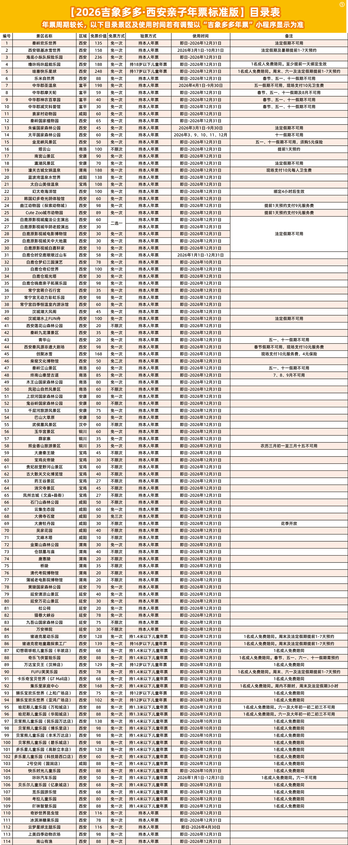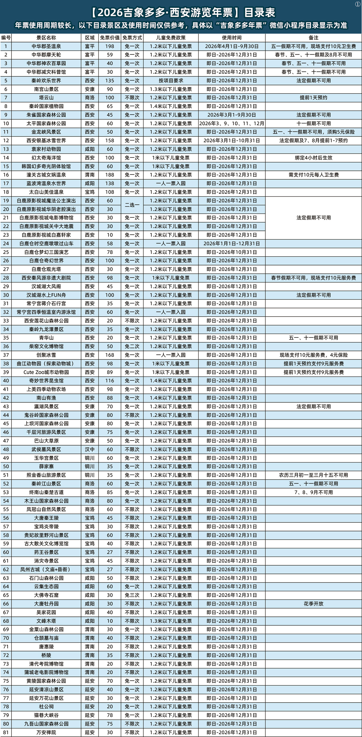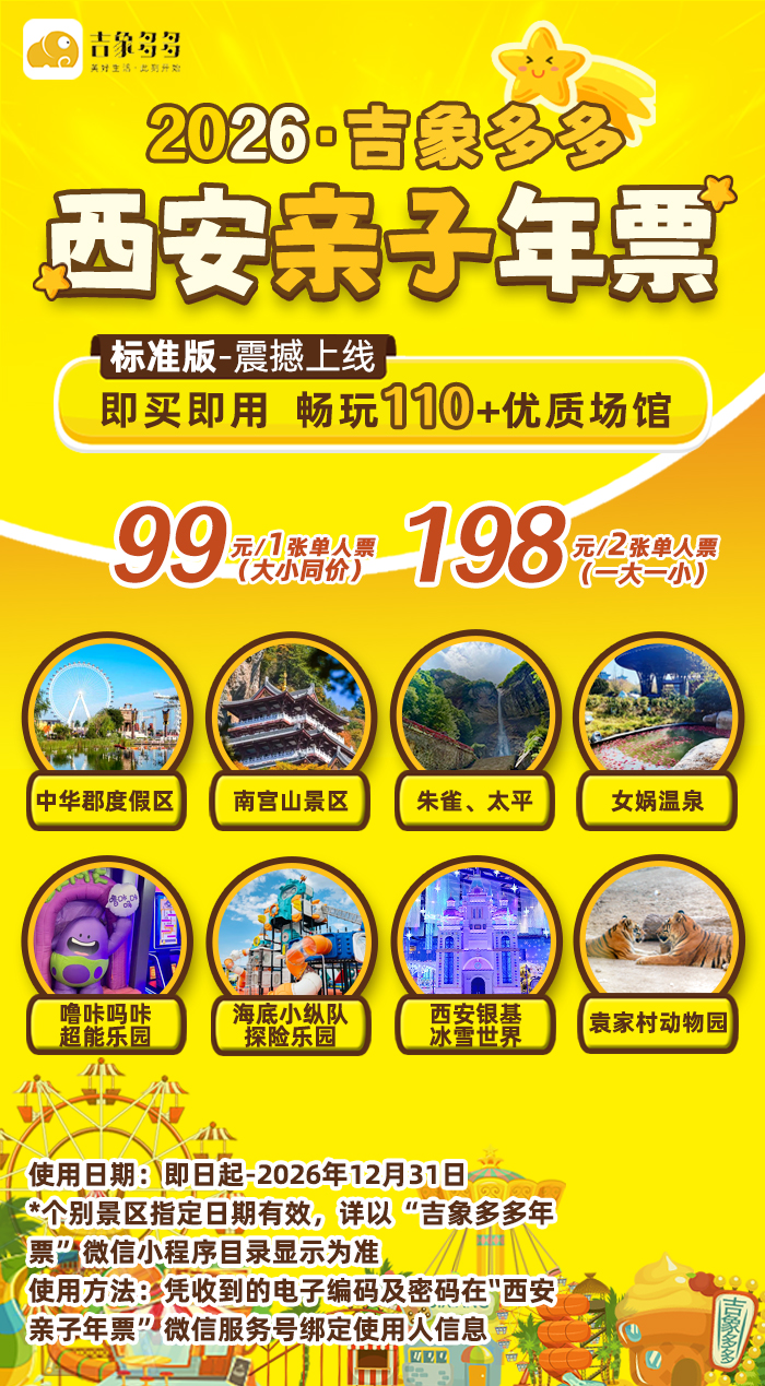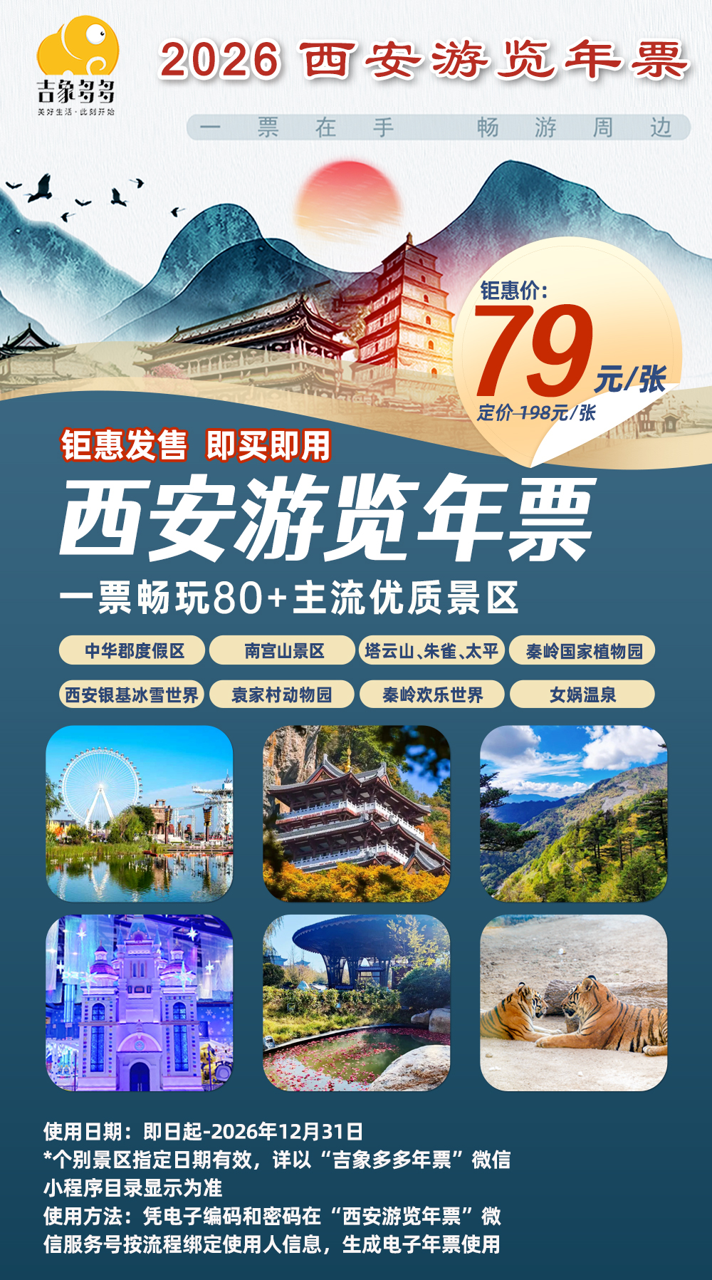 预订说明:① 吉象多多2026西安旅游年票一张,具体游玩景区请参考景区详情