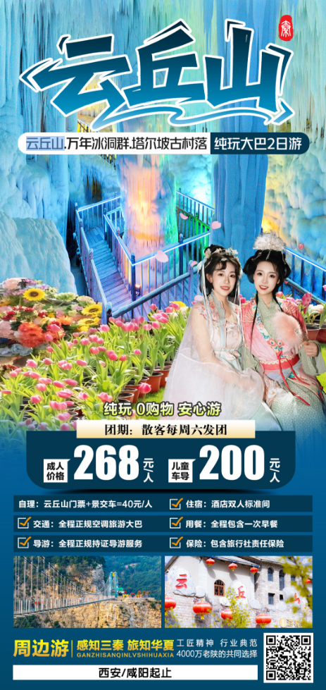 早07:00左右集合(具体时间地点以导游通知为准),乘车赴国家AAAAA级旅游景区【云丘山风景区】(车程约3.5小时),素有“姑射最秀峰巅”“河汾第一名胜”的美誉,云丘山景区拥有丰富的自然资源、人文景观和文化遗产,是晋南地区少有的集旅游观光、休闲娱乐、度假养生、民俗体验于一体的综合性旅游度假区。抵达后自由享用中餐,中餐后游览【神仙峪】,这里溪水潺潺、鸟语花香、青山绿水,相传,真武大帝的前身“鲧”在此地修炼成仙;品一口神泉,甘甜可口;再步行约25分钟抵达国内发现规模最大的【自然冰洞群】。每逢三伏盛夏,洞外酷暑炎炎,洞内却寒气逼人,滴水成冰,更为奇观的是犬牙交错的冰凌柱争奇斗艳,十分壮观。可体验滑翔翼,旱地滑雪,高空滑索等体验性项目。之后到达【塔尔坡古村】,参观上千年的古村落,距今2500年历史的塔尔坡古村,走进塔尔坡古村,到处是石墙、石窑、石洞,仿佛穿越千年,这里不仅能欣赏到最古老的“结婚迎亲仪式”,还可以品尝农家饭、大碗茶,看皮影戏,捏花馍、欣赏武术表演、打铁艺等民间非遗体验项目。参观旧时候留下来的生活遗迹,更有特色迎亲仪式表演(上午11点,下午15点每天两场),参观后可登玉莲洞,此处为全真教教主丘处机的修炼之地,登高望远,自由享用晚餐后(可报团餐吃当地特色水席)入住酒店。