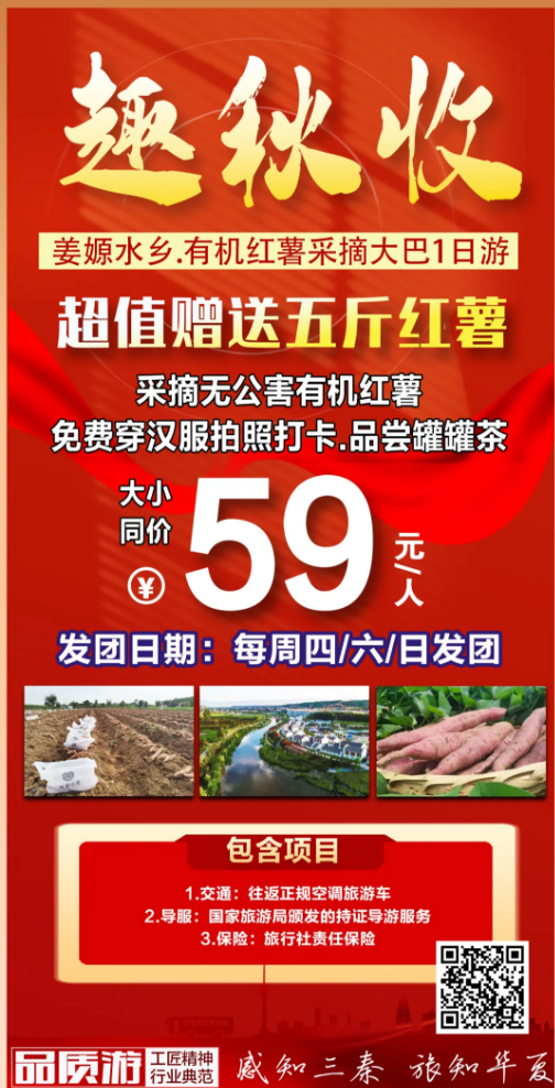 早07:00左右在西安指定地点集合出发(具体集合时间地点出团前一天以导游通知为准)乘车包茂高速前往武功(车程约1.5小时),前往游览【苏武纪念馆】苏武字子卿,汉武帝天汉元年奉命出使匈奴,被扣留后放逐北海牧羊十九载,为中华民族最具代表性的爱国主义典范,位封“汉典属国”。后乘坐【画舫游船】体验漆水河自然风光;结束在【姜嫄水乡】自行用餐,品尝“旗花面”等当地特色小吃。下午【品罐罐茶】,在美食街区参加NPC互动游戏赢银票免费吃喝玩乐,【红薯采摘】姜嫄水乡百亩农业园种植了无公害有机红薯,游客可在景区工作人员指定区域采摘红薯叶。下午适时结束行程后乘旅游车返回西安!
