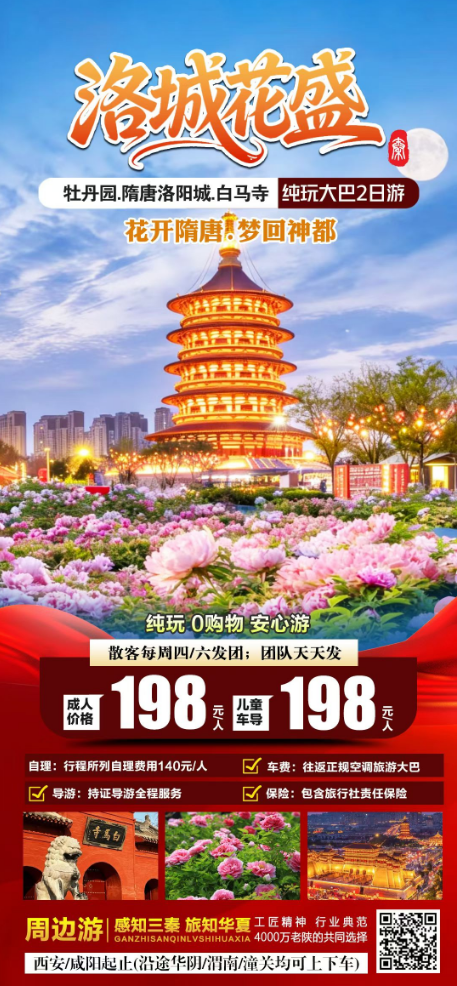 预订说明:① 跟团游产品受季节和景区政策影响,价格可能会有变动,请提前咨询客服 (如未成团,可安排其他行程)。 包含项目: 1.交通:往返正规空调旅游车。 2.导服:国家旅游局颁发的持证导游服务。 3.保险:旅行社责任保险(建议游客另行购买人身意外险)。 自理项目:1晚住宿+1早餐+综合服务费旅行社打包价140元/人(须产生)。 自选项目:隋唐洛阳城门票(应天门+九洲池+天堂明堂)挂牌180元/人,旅行社优惠价100元/人(自愿产生,60周岁以上凭证件免门票)。 白马寺门票35元/人(自愿产生,60周岁以上凭证件免门票)。 神州牡丹园门票挂牌50元/人,旅行社优惠价30元/人(自愿产生,70周岁以上凭证件免门票)。 儿童收费:1.2米以下儿童含车费,不含景点门票、酒店床位,若发生其他费用客人带小孩现付。 特别提示:若花期受天气影响导致观赏不佳,属不可抗力因素,敬请谅解! 备注:迟到超过集合时间20分钟者视为自动离团,过时不候,需自行返回西安!