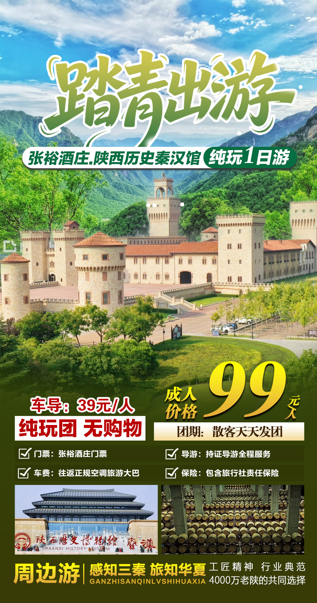 早上8:00出发前往【陕西张裕长歌酒庄】(原张裕瑞那城堡酒庄)抵达景区后前往游客服务中心领取手环和抽奖币(行程中有抽奖环节哦!100%中奖!幸运游客可获取“自灌白兰地100ml”1瓶或者巧克力),随后讲解带领参观游览陕西张裕长歌酒庄,步行经过生生不息雕塑沿着法桐路游览酒庄的酿酒葡萄园,进入酒庄后,讲解员为大家讲解酒庄的历史文化并观看4D影片,让大家更能一览酒庄的全景。随后参观张裕酒庄史馆,由讲解员给大家介绍“张裕”二字的由来,继续跟着讲解员的脚步了解酒庄文化,还可以制作闻香卡。在长歌AI智能实验室,每个人可领取一支100ml的酒瓶,根据自己口味可自行调制酒并免费带走(在此可品尝到干红、甜红、桃红、白兰地4种不同口味的葡萄酒)。在长歌AI体验中心,大家不仅是品鉴者,更是创造者。意犹未尽的朋友们,可继续前往全球首个“长歌AI葡萄酒交易港”,这里将葡萄酒与股票概念结合,游客能“用嘴投票”,体验“甜酒指数”的涨跌趣味。目前,长歌以消费者喜爱的甜葡萄酒为基酒,研发出9种不同风味的葡萄酒,涵盖葡萄柚、草莓、樱桃、山楂、凤梨、咖啡等口味,还有无醇款。每种风味的葡萄酒,可看作一只“股票”,游客通过扫描手环中的二维码,在20分钟畅饮时间内,用额度“交易”不同风味的长歌天然甜葡萄酒(可畅饮200ml)。品尝结束后,大家可在酒庄园区内自由游览,作为经典拍照打卡胜地,张裕瑞那城堡酒庄拥有纯正的意大利托斯卡纳风格城堡和800亩广袤葡萄园。许多游客在此流连忘返,随手一拍便是充满欧陆风情的大片。在这座充满甜蜜的酒庄里,不仅有短剧的潮流基因,更藏着张裕对葡萄酒未来的大胆创新,一场以“科技+风土”为双翼的甜蜜革命,正从这里发酵……中餐自理,餐后乘车前往【陕西历史博物馆秦汉馆】,作为陕西历史博物馆分馆,场馆总占地面积约300亩,建筑面积39809平方米,展陈面积10362平方米,该馆集文物保护、陈列展览、学术研究、科普教育等功能于一体,基本陈列“天下同一——秦汉文明主题展”通过1500余件(组)文物及多媒体装置展现秦汉政治、经济、文化成就,专题展“城与陵”展示秦汉遗址考古成果,“技与美”专题展呈现秦汉艺术与科技。游览结束后乘车返回,结束愉快的一天!
