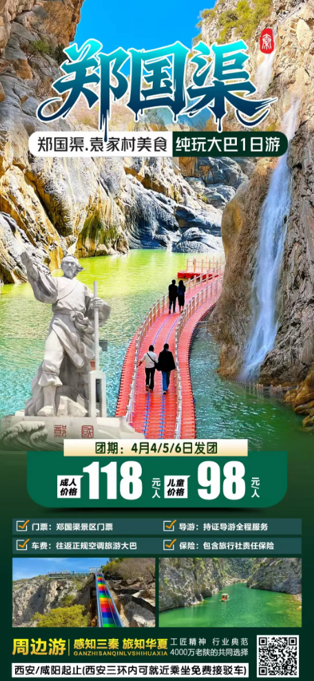 预订说明:① 早07:00指定地点集合乘车(车程约1.5小时)赴【郑国渠旅游风景区】,之后前往关中印体验地【袁家村】参观,集合乘车返回西安,结束愉快旅途!(如不成团,可安排其他行程) 儿童收费:1.2米以下儿童含车费及导服,不含景点门票,若发生其他费用客人带小孩现付。 费用不含:郑国渠景交车30元/人(必须产生) 65周岁以上老人及证件免票人员景区保险5元/人(必须产生,需要证件原件)。 推荐自费:郑国渠快艇60元/人次(约20分钟)、观光船50元/人次(约40分钟)等娱乐项目,根据您的旅程游览需要,请自行合理安排!